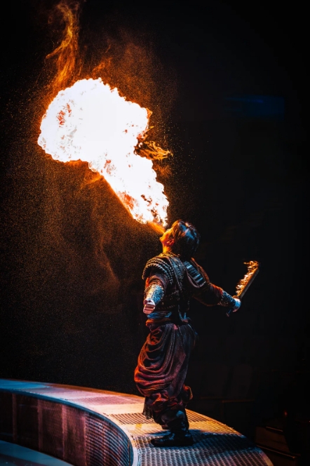 “本次升級(jí),我們采用“天幕地屏+激光投影”的立體舞臺(tái)設(shè)計(jì),打破了傳統(tǒng)演出的空間限制,給觀眾帶來前所未有的沉浸式體驗(yàn)?!睂?dǎo)演閔銳接受采訪時(shí)說,“《王的戰(zhàn)車》以北方部落的古老傳說為藍(lán)本,將傳統(tǒng)技藝與現(xiàn)代科技巧妙融合。比如縵吊演員的表演象征著部落信仰的升華,而噴火表演則象征著勇士的熾熱斗志。整場(chǎng)演出既保留了傳統(tǒng)雜技的力量與驚險(xiǎn),又通過全息投影技術(shù)等科技手段賦予其全新的藝術(shù)表達(dá),希望觀眾在觀演的過程中,除了感受到震撼,也能體會(huì)到中國(guó)傳統(tǒng)文化的深厚底蘊(yùn)與傳承。